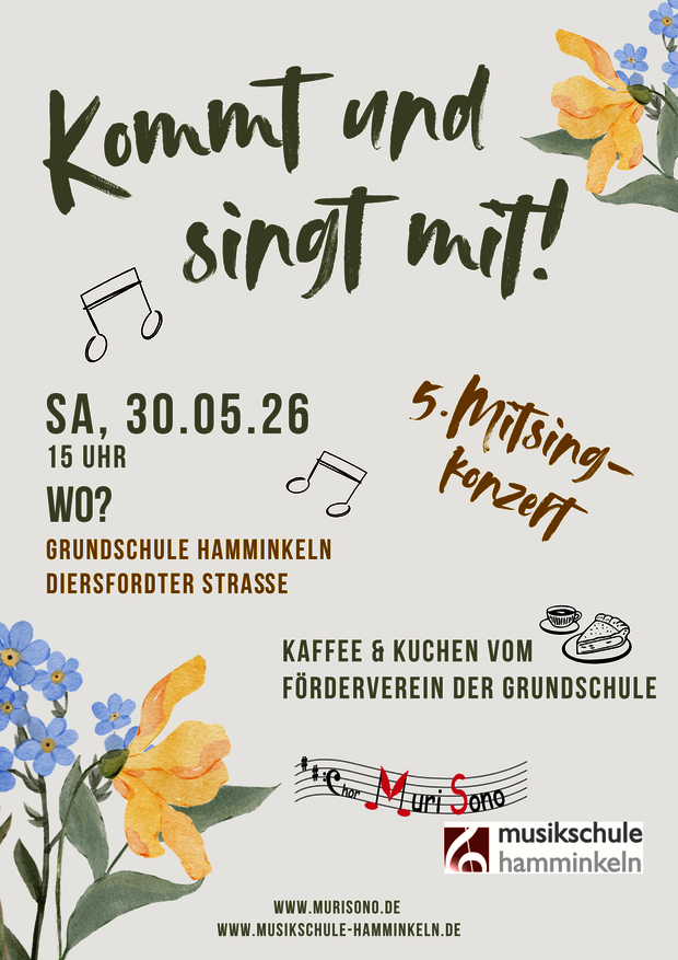 Zu einem geselligen gemeinsamen Singen laden der Chor Murisono und die Musikschule Hamminkeln am Samstag, dem 22.10 um 15 Uhr in die Bürgerhalle nach Loikum ein.